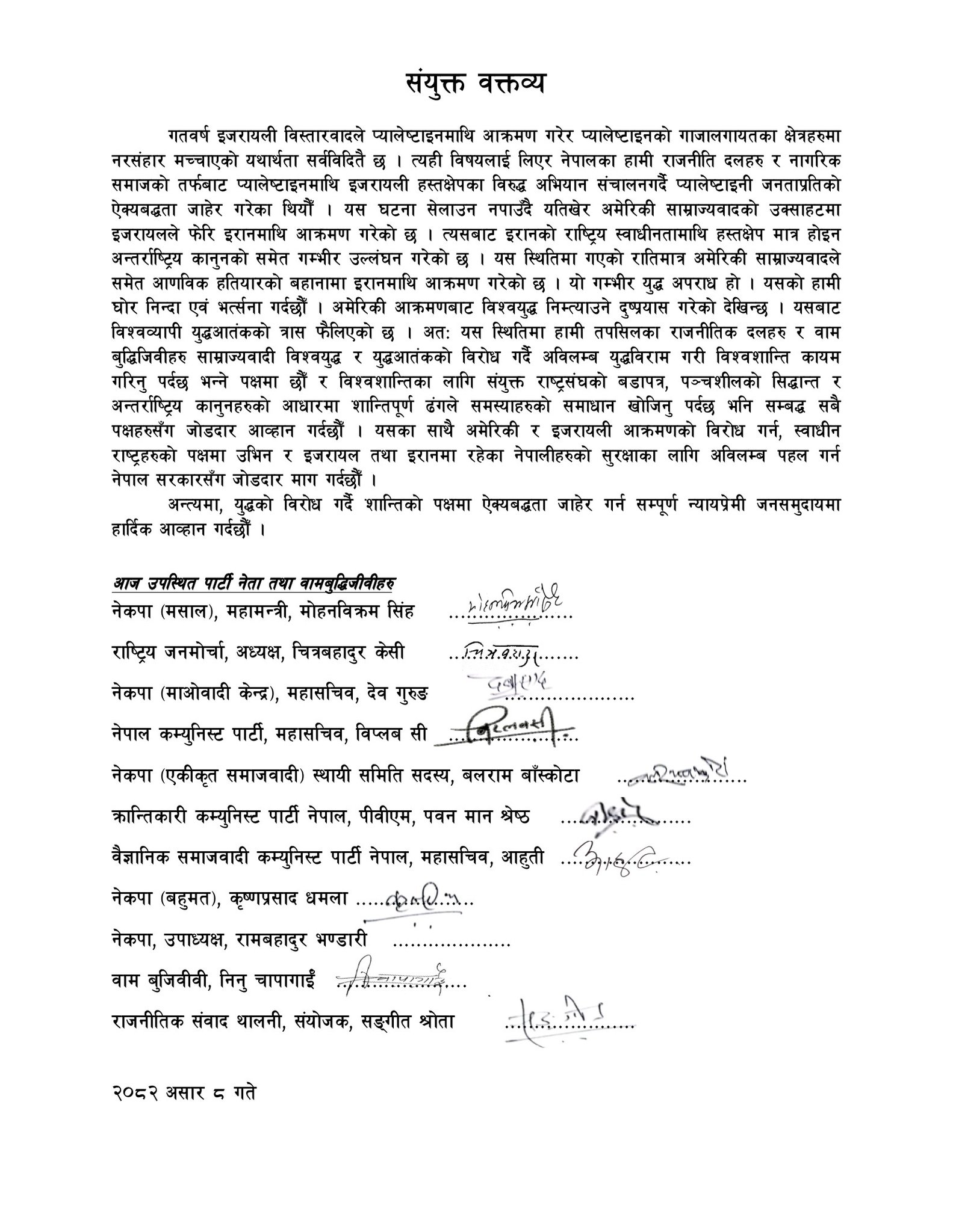 दलका प्रतिनिधिहरुले साम्राज्यावादी युद्धको विरोध तथा खेद प्रकट गरे । बैठकमा इरानमाथि साम्राज्यवादी हमलाको बारेमा संयुक्त रुपमा वक्तव्य जारी गर्दै विरोध कार्यक्रम गर्ने निर्णय गरेकाे छ ।